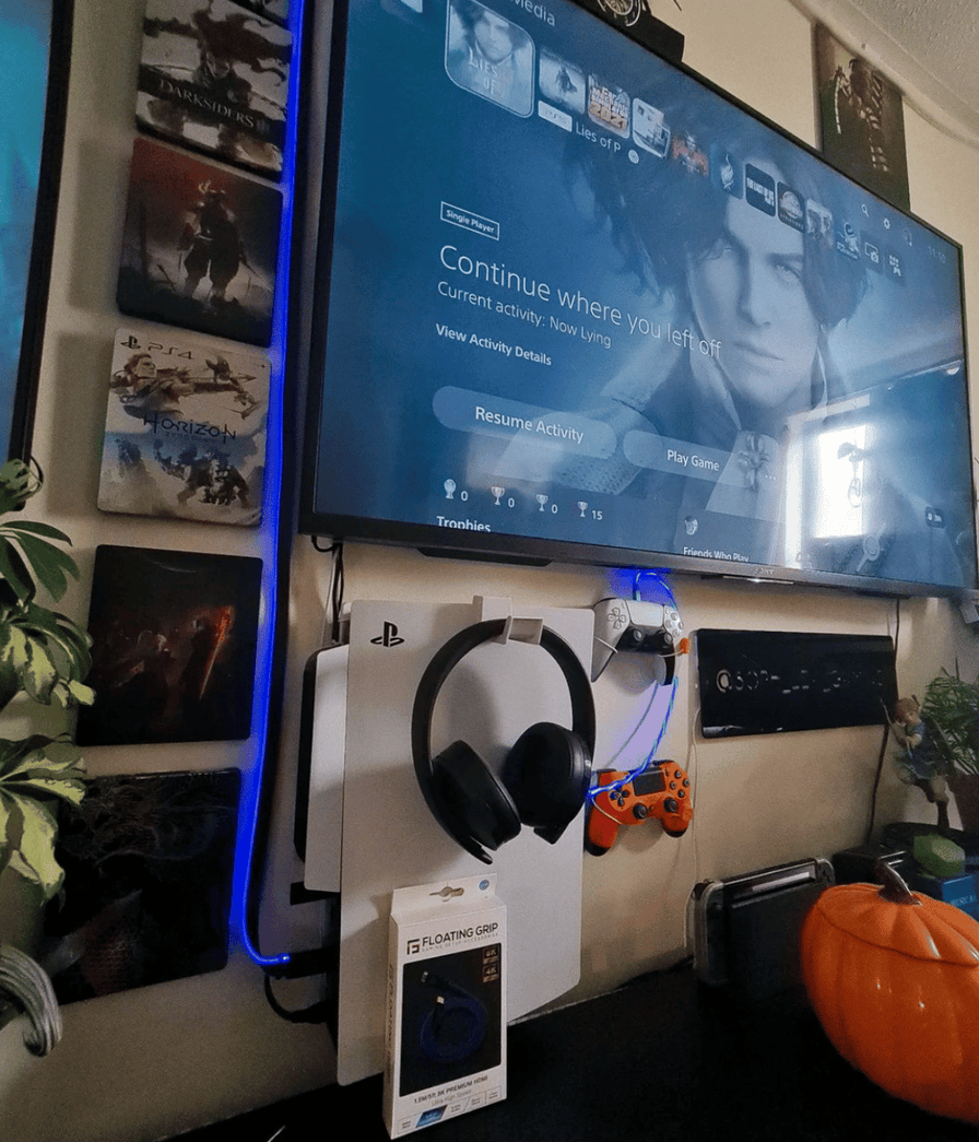 This customer image shows a PS5 mounted on the wall with a FLOATING GRIP wall mount, accompanied by the FLOATING GRIP HDMI LED cable, glowing with a vibrant blue light. The clean setup highlights the sleek design of the console and accessories, adding both style and function to the gaming space.
